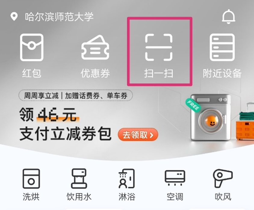 ②吹风机:使用校园邦办小程序,扫描吹风机二维码,根据支付生成的密码,输入吹风机设备上即可使用。