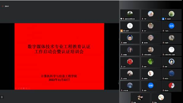 为加强专业内涵建设,计算机科学与信息工程学院决定开展和推进“工程教育专业认证”工作。2022年11月22日,学院组织召开了关于数字媒体技术专业工程教育认证工作启动线上培训会。学院领导班子、数字媒体技术全体教师、全体辅导员、教科办主任、实验中心主任等相关人30名教师出席了会议,本次会议由数字媒体技术系段喜萍主任主持。开展工程教育认证这件事是我院教育改革必然趋势和内在要求,也是促进工科专业提质增效、提高人才培养质量的重要契机。数字媒体技术专业为国家级一流本科专业建设点,学院以该专业为试点,开展工程教育认证工作。会议主要内容如下: