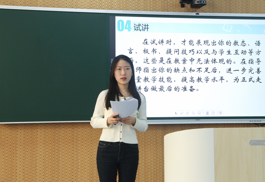 接下来,由优秀实习生代表李珍妮同学介绍实习过程中的收获和成长。从完成具体学生教学工作到所承担的班主任职责,最后进行了实习经验分享。详细介绍了听课、备课、说课、试讲、讲课、课后反思等六个环节中的基本知识及注意事项,从学生的角度出发思考问题,以达到更加优秀的教学程度。
