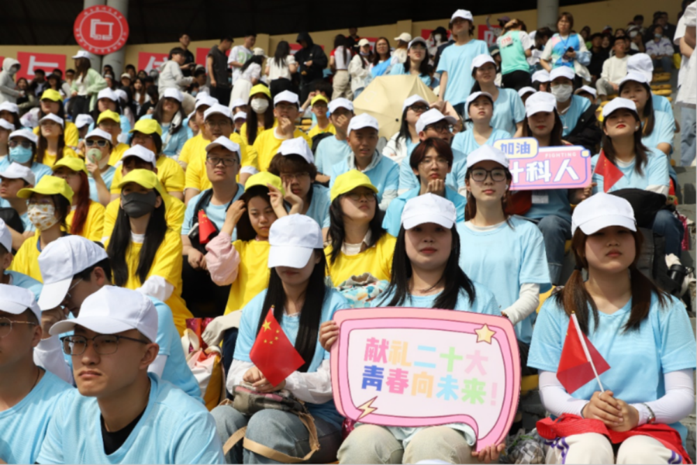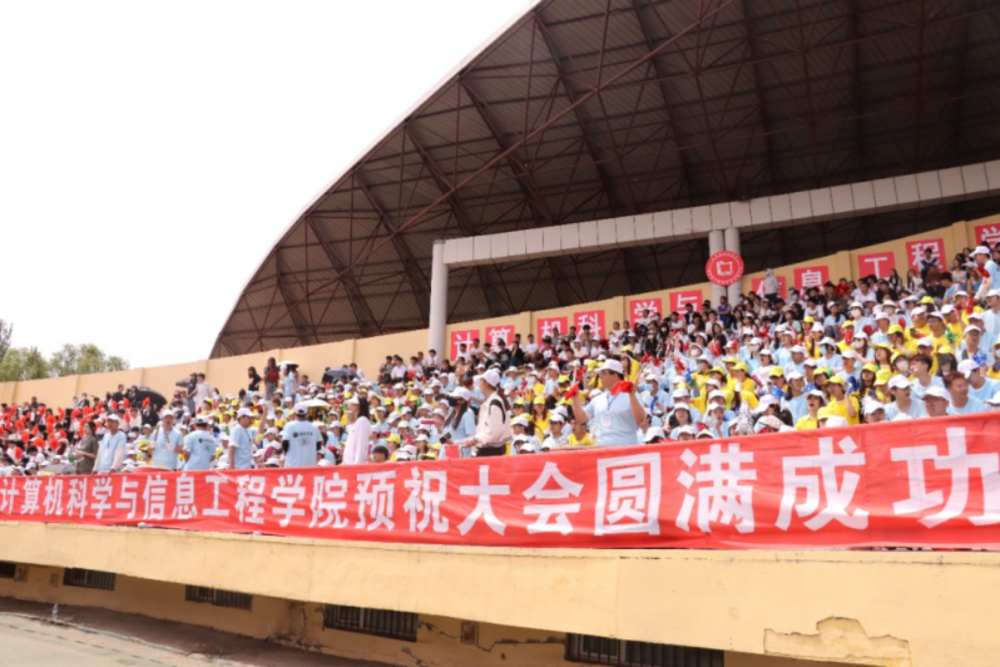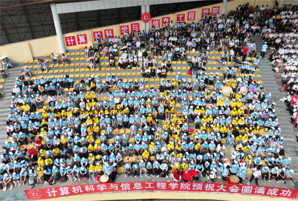 “激扬青春,超越梦想,天高地迥,任我飞翔!”观众席喊起一声声响亮的口号,为运动员们加油助威!经过师生们的共同努力,观众席用蓝黄色的衣服摆出“计科”二字,展现了计科学子的精神面貌!