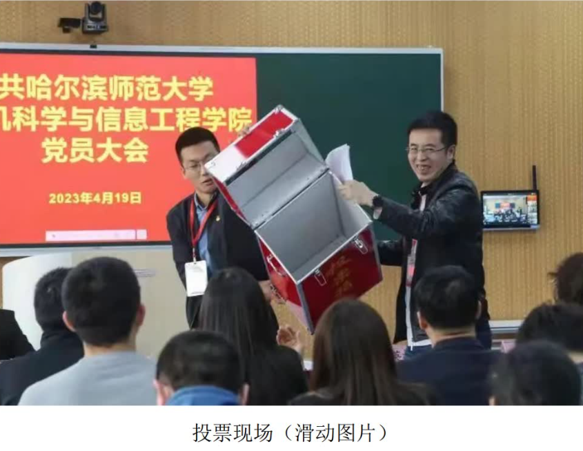 会议以举手表决的方式通过了《中共哈尔滨师范大学计算机科学与信息工程学院新一届委员会第一次全体会议选举办法》及监票人、计票人名单。采取无记名投票方式,选举产生了学院党委书记、副书记,冯丽伟同志当选为学院党委书记,周国辉同志、郝俪娜同志当选为学院党委副书记。