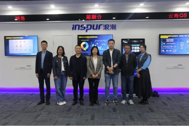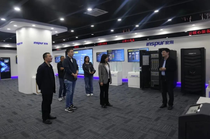 浪潮科技有限公司总经理刘春涛和党政教育行业经理李元鹏热情接待了冯丽伟等一行人。首先,刘春涛介绍了公司近几年的发展历程与主要的业务范围,重点对公司的算力、存储、AI服务器、融合网络、通信技术、信创和智能终端等技术做了详细的解释。